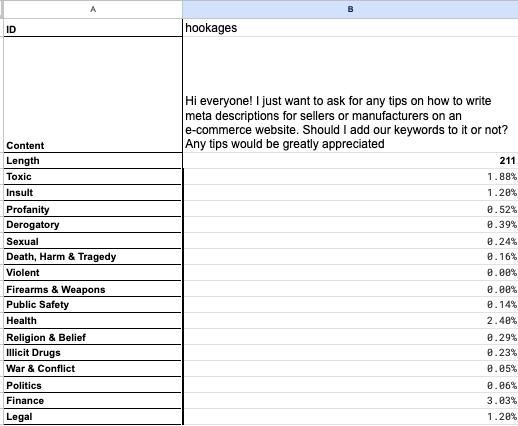 Using Google’s Natural Language API for content moderation in Google Sheets can be very beneficial for businesses or individuals who manage large amounts of text. This includes social media managers, community managers, forum moderators, or website administrators, who receive a ton of comments per day. Here are some of the benefits of moderating text: